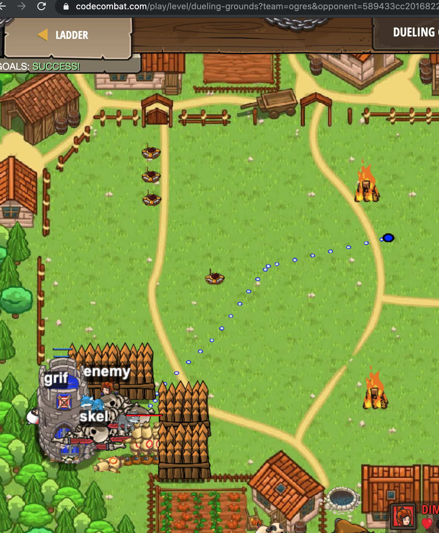 I’ve also recently looked at DimaP’s strategy in Dueling grounds. He builds fences in the bottom right corner then summons decoys for the rest of the game. After the 10th second not one line of my code is run while I get killed by the skeletons.