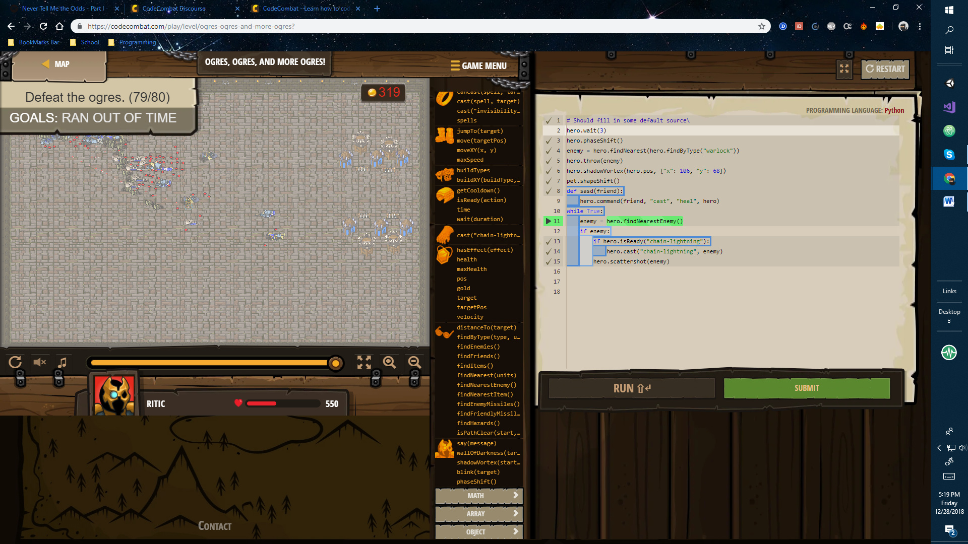 uh IDK how to make a level. so basically if you run it, it’s VERY slow or not even playable. sorry. I don’t know how to make a level. If someone could just make a real level from this… the story is that you were wandering around some temples and pressed a button. It triggered HUGE amounts of ogres. But, you built a fortification to protect you and the pixie made most of the ogres inside a rock. she also messed up most of the big rocks…for some reason, ritic decided to chime in. https://codecombat.com/editor/level/dusty-old-temples-and-oh-a-button#