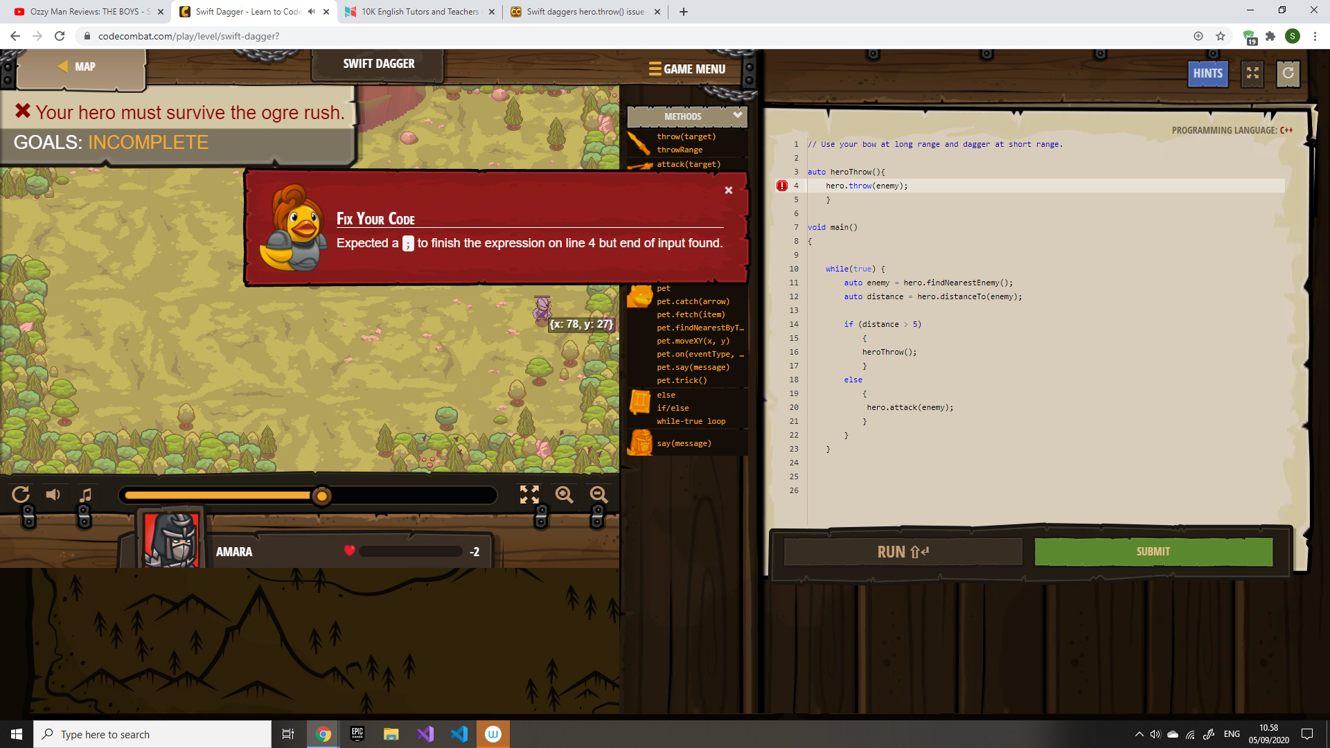 you can see the blue “throw” command indicating a c++ anchor term in the “hero.throw” command, and the program asking for me to close an expression that appears to me to be closed.